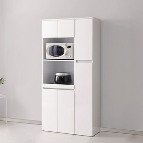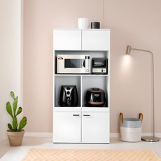 전자렌지, 밥솥, 정수기 등 다양한 주방 기기를 올려놓을 수 있는 화이트 색상 수납장으로, 공간을 효율적으로 활용하며 깔끔하게 주방을 정리할 수 있는 완제품 렌지대임.