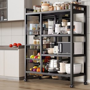 4단 구조의 조립식 블랙 주방 수납장으로, 주방용품과 식재료를 깔끔하게 정리할 수 있으며, 진열과 보관이 동시에 가능하고 공간 효율성을 높이는 디자인임.