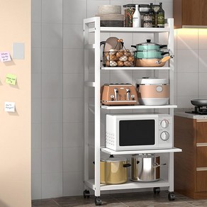 5단 구조로 다양한 주방용품과 전자레인지를 효율적으로 수납할 수 있는 흰색 주방 선반으로, 깔끔한 디자인과 견고한 구조로 공간 활용도를 높이고 주방을 정리정돈하기에 적합함.