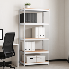 화이트 컬러의 철제 무볼트 경량 구조로 제작되어 간편하게 조립할 수 있으며, 1200x500x1800mm 크기와 5단 구성으로 가정, 사무실, 창고 등 다양한 공간에서 효율적인 수납과 정리가 가능한 다용도 앵글 선반