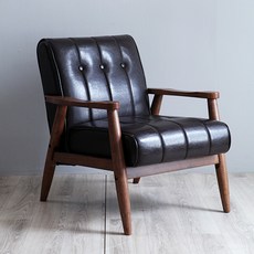 빈티지 감각의 모카 브라운 1인용 소파로, 통나무 실목 프레임과 PU가죽 소재로 제작되어 편안하면서도 내구성이 뛰어난 착석감을 제공함.