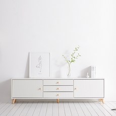 넓은 상판과 다양한 수납 공간을 갖춘 거실장으로, 화이트 색상으로 깔끔한 인테리어 연출이 가능하며 TV와 장식품을 안정적으로 배치할 수 있음.