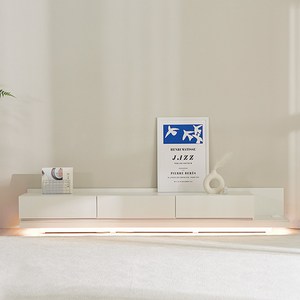 LED 조명과 확장형 구조로 다양한 수납이 가능하며, 올화이트 색상으로 깔끔한 거실 인테리어를 연출하고 대형 TV도 안정적으로 배치할 수 있음.