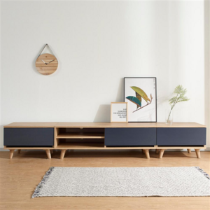 2400mm 넓이의 메이플·네이비 조합으로 제작되어 대형 TV 거치가 가능하며, 다양한 수납 공간을 제공해 깔끔하고 실용적인 거실 연출이 가능한 거실장이다.