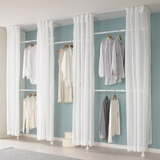 화이트 컬러의 철제 구조로 제작되어 설치가 간편하며 커튼 포함으로 깔끔하게 의류를 정리할 수 있는 드레스룸 행거