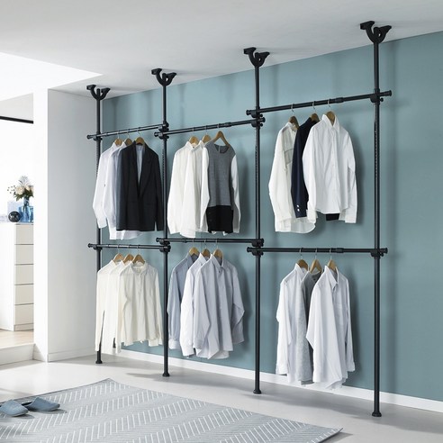 블랙 컬러의 견고한 철제 구조로 제작되어 넉넉한 수납과 세련된 드레스룸 연출이 가능한 시스템 행거