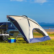 차량에 설치 가능한 어닝 가림막 텐트로, 네이비 색상이며 야외 활동 시 햇빛과 바람을 차단하고 휴식 공간으로 활용 가능한 제품이다.